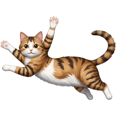 brown tabby and white cat with doing a big extremely long stretch reaching up into the air with arms and legs side by side together straight and overextended whilst lying on its side emoji | AI Emoji Generator