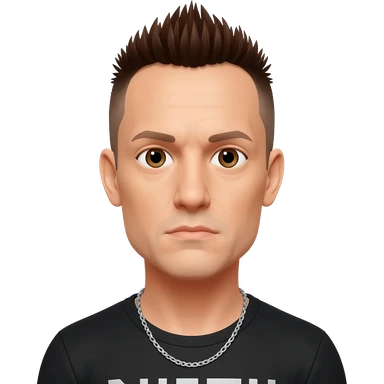 Chester Bennington with brown eyes, dark brown mohawk hair, black metallic t-shirt, silver necklace emoji