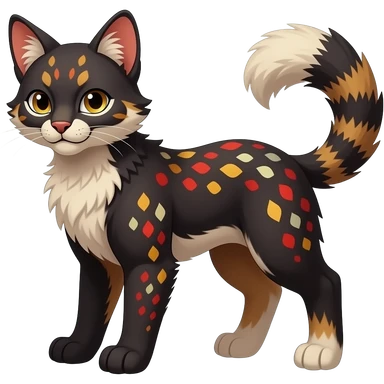 Dark gloomy red-golden-brownish-beige-gradients colorful painted marked patterned Asian glorious divine exotic cute cool beautiful shiny beautiful fantasy-caracal-civet-genet-sergal-vernid-Cacomistle-oncilla-animal-Fakémon-hybrid-fursona (full body) emoji