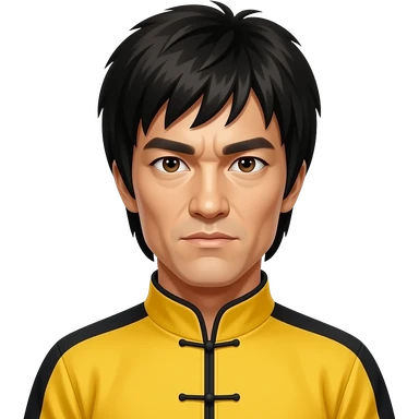 Bruce Lee with dark brown eyes, black hair, yellow martial art outfit emoji