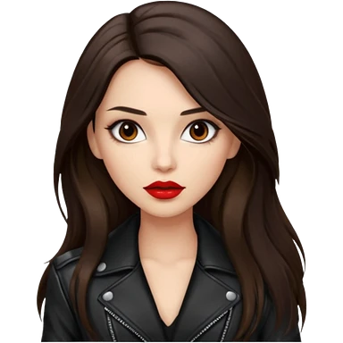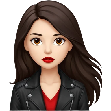 brunette with very long hair in black cuir jacket with red lips and very dark brown eyes and white shirt emoji