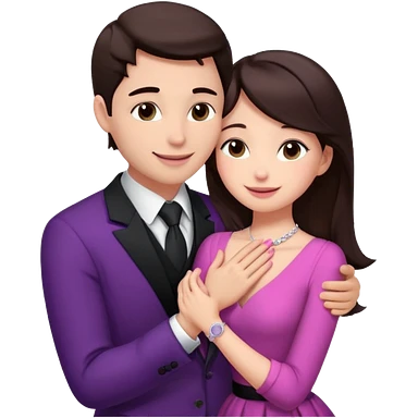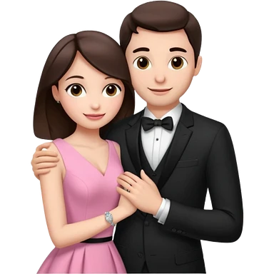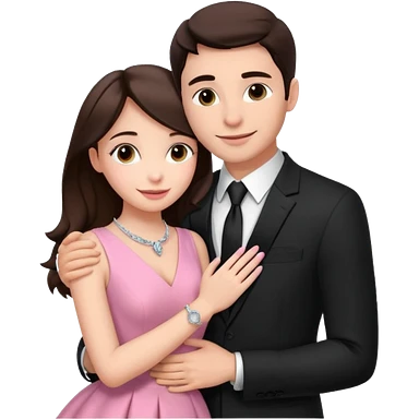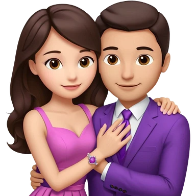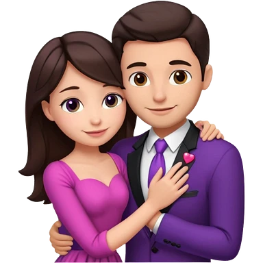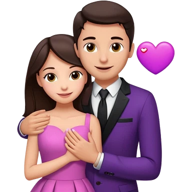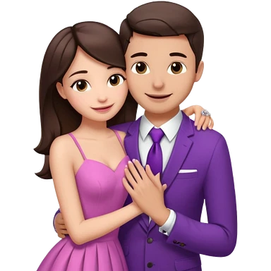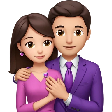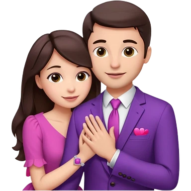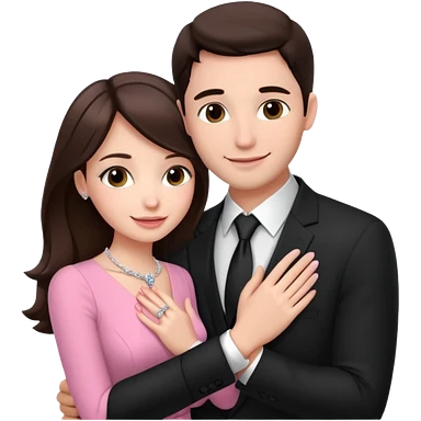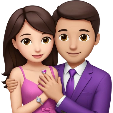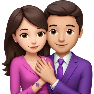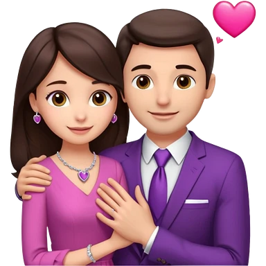 Brunette girl, with an engagement ring on her finger hugging a handsome man, (her boyfriend) both of them happy, she’s wearing a pink dress, he is wearing a black suit, he’s also a rich businessman, and there is the 💜 purple heart emoji on top. They look in love with each other. emoji