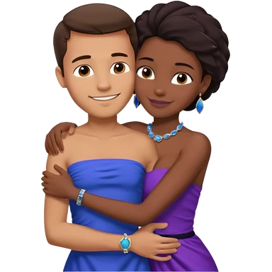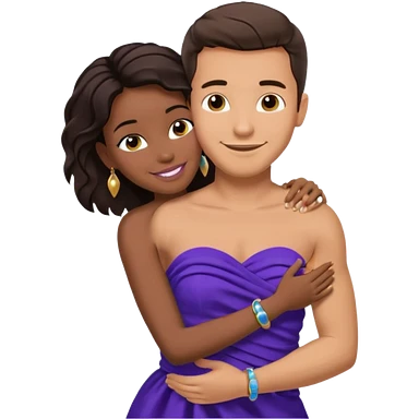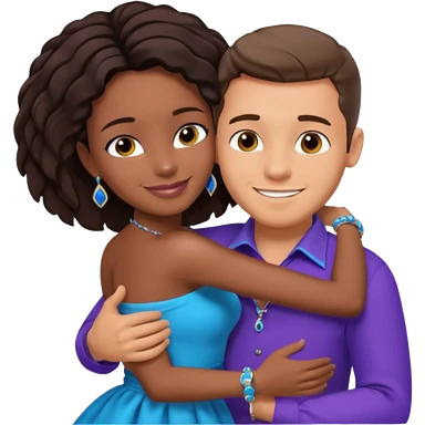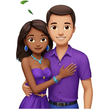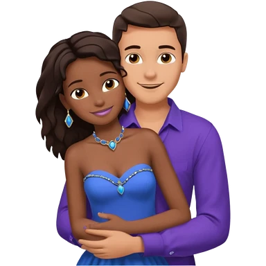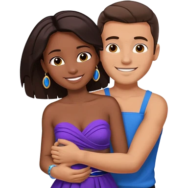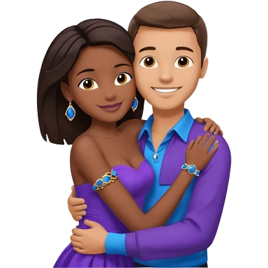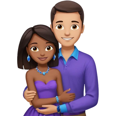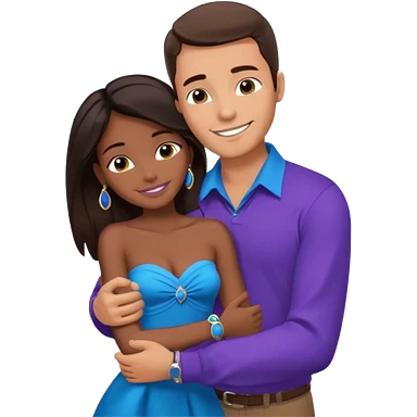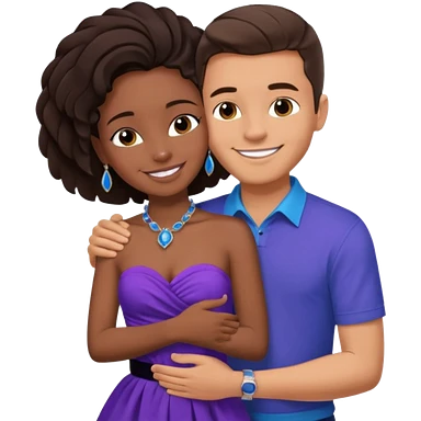 Tan brunette European male in blue shirt smiling and hugging a jet black African girl in purple strapless dress and blue jewelry emoji
