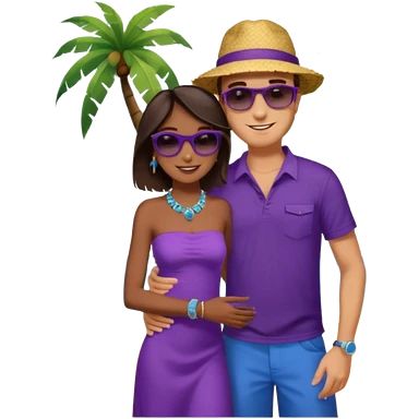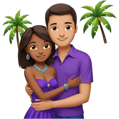 Tan tall brunette European male in blue shirt smiling and hugging a jet black African girl in purple strapless dress and blue jewelry they are on a beach with palm trees emoji