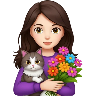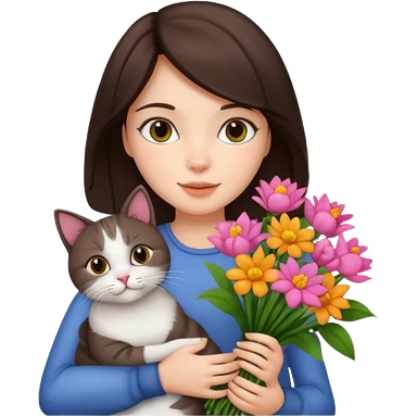 brunette woman holding bouqet and cat emoji