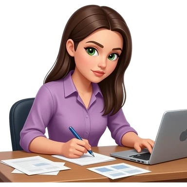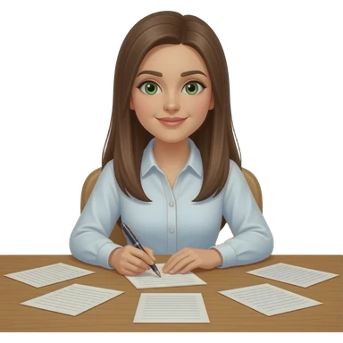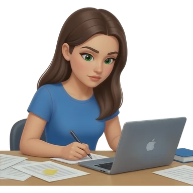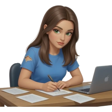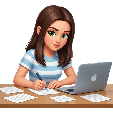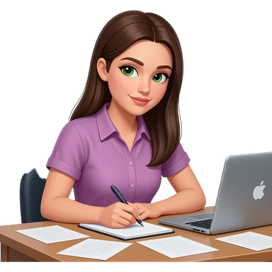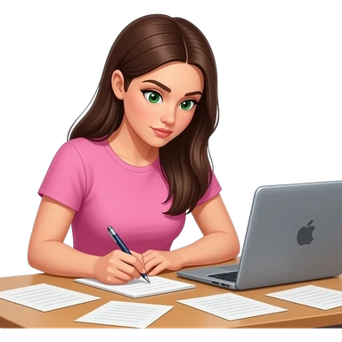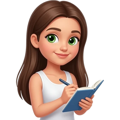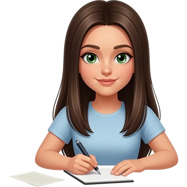 caucasian woman with long dark brown hair and dark brown eyes writing notes emoji