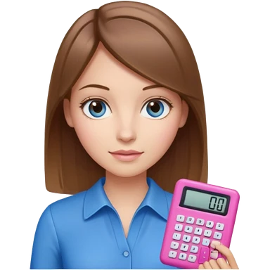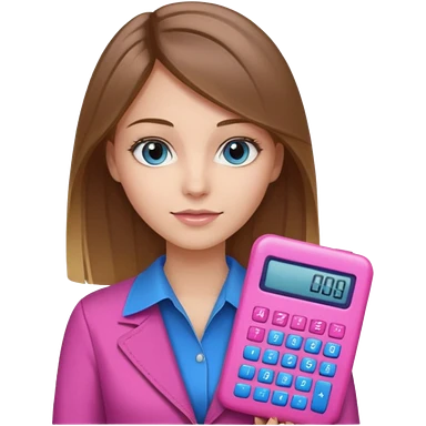 pretty female with long wavy brown hair with blonde highlights and blue eyes holding a pink calculator emoji