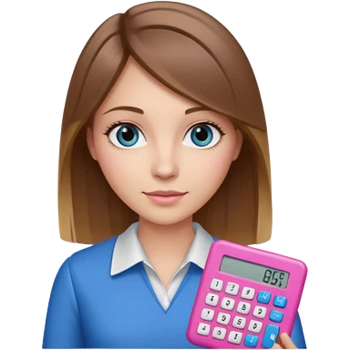 female with straight brown hair with blonde highlights and blue eyes holding a pink calculator emoji