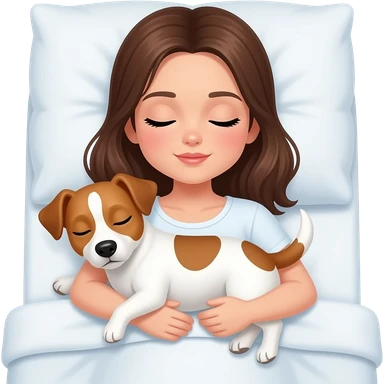 Brunette girl in bed sleeping with fullgoldenbrown color jack russel upon her emoji