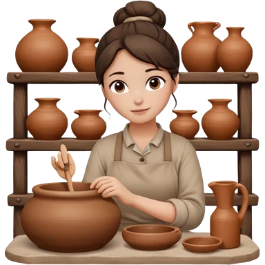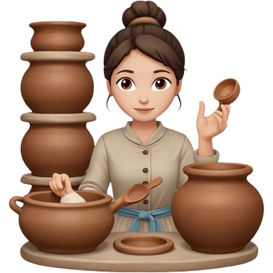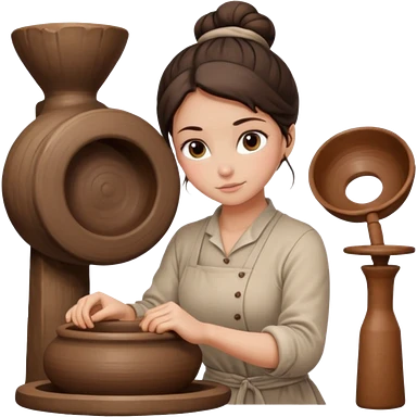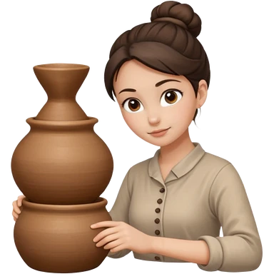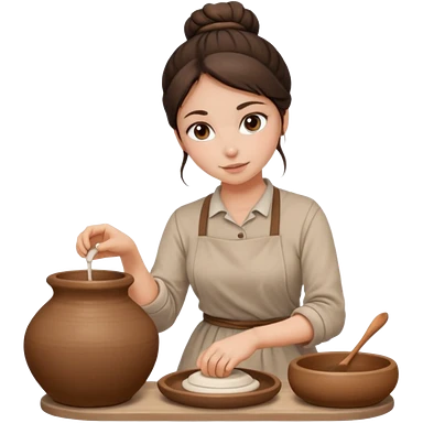 Brunette girl with a bun, behind the potter's wheel, wearing neutral clothing emoji
