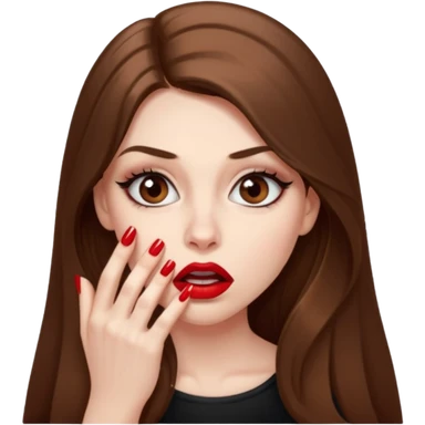 A girl with long brown hair, eyeliner, long lashes, light brown eyes, pale skin and red lipstick biting her nails nervously. emoji