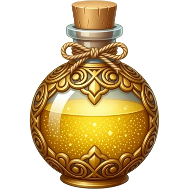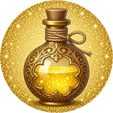ornate golden potion bottle with intricate filigree, filled with shimmering luminous gold liquid, decorative cap tied with twine, glittering gold background, magical luxury aesthetic emoji