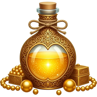 ornate golden potion bottle with intricate filigree, filled with shimmering luminous gold liquid, decorative cap tied with twine, surrounded by golden beads and an ornate box, glittering gold background, magical luxury aesthetic emoji