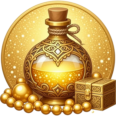 ornate golden potion bottle with intricate filigree, gemstones embedded, filled with shimmering luminous gold liquid, decorative cap tied with twine, surrounded by golden beads and an ornate box, glittering gold background, magical luxury aesthetic emoji