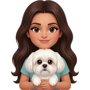 Brunette girl with brown long hair, hugging her Shih tzu white emoji