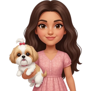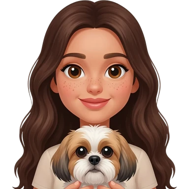Brunette girl with long hair and beauty spots holding shih tzu emoji | AI Emoji Generator