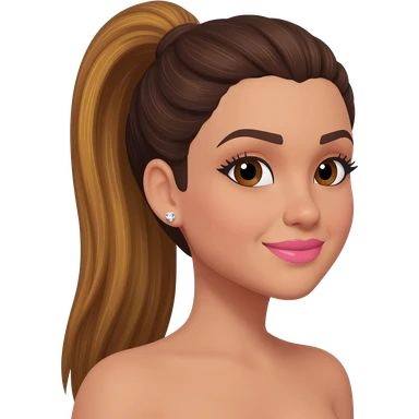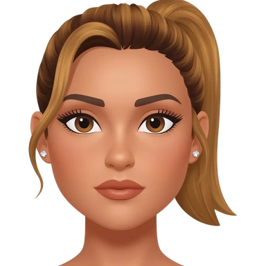 brunette with golden brown hair with dark brown roots in a high ponytail, dark brown eyes, medium brown eyelash color, full lips, small button nose, fair skinned like of olive color, with full eye lashes, diamond earring studs emoji