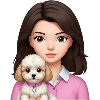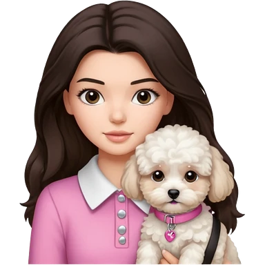 Kendall Jenner style brunette with long hair holding a white Maltipoo dog with a pink collar emoji
