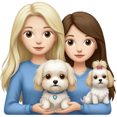 two women holding Maltese dog one is brunette the other is blonde long haired emoji