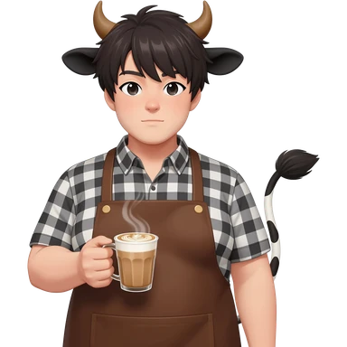femboy in a checkered shirt with extra large fat tits with cow ears and cow tail dressed like barista in brown apron with latte in his hand emoji