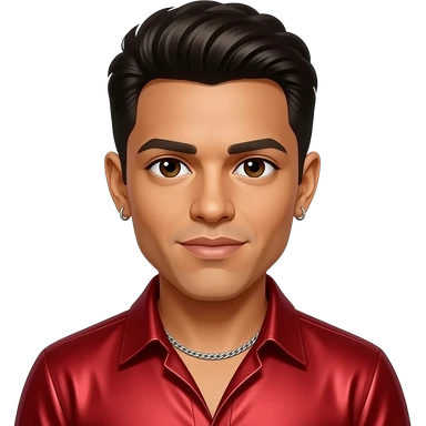 Bruno Mars with dark brown eyes, dark brown hair, red metallic shirt, silver necklace and short earrings emoji