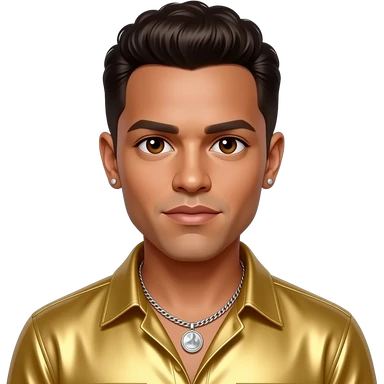 Bruno Mars with dark brown eyes, dark brown hair, gold metallic shirt, silver necklace and short earrings emoji