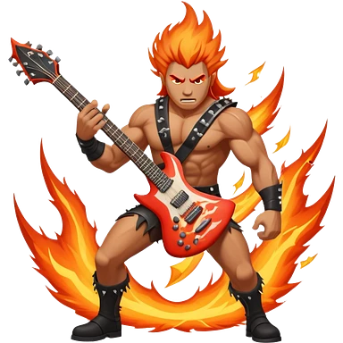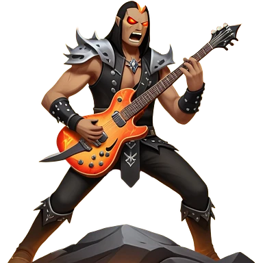 An icon showing a rock musician wielding a guitar in an epic battle, inspired by Brutal Legend. The design features fiery backgrounds, musical notes floating in the air, and electrifying stage lights, capturing the power of music and combat. Transparent background highlights the energy. emoji