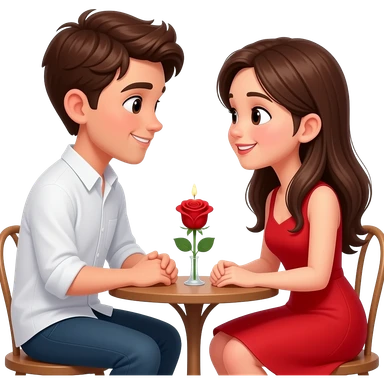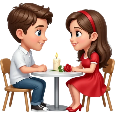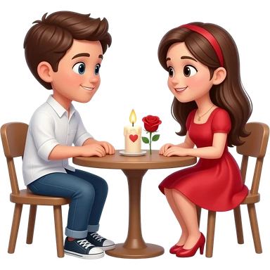 Doi oameni tineri stau la o masă mică, față în față. Un băiat cu păr șaten și cămașă albă și o fată cu păr lung și rochie roșie. Pe masă este o lumânare aprinsă și un trandafir. Ei zâmbesc și se privesc în ochi, într-o atmosferă romantică de Valentine’s Day emoji