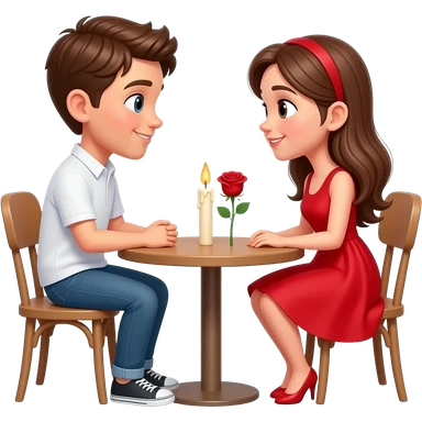 Doi oameni tineri stau la o masă mică, față în față. Un băiat cu păr șaten și cămașă albă și o fată cu păr lung și rochie roșie. Pe masă este o lumânare aprinsă și un trandafir. Ei zâmbesc și se privesc în ochi, într-o atmosferă romantică de Valentine’s Da emoji