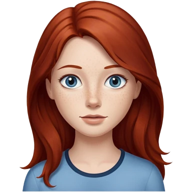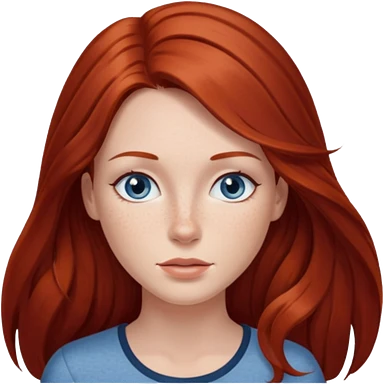 woman with long dark auburn red hair that is mostly straight but has slight waves to it. grey blue eyes. some freckles emoji