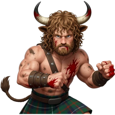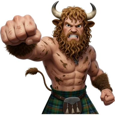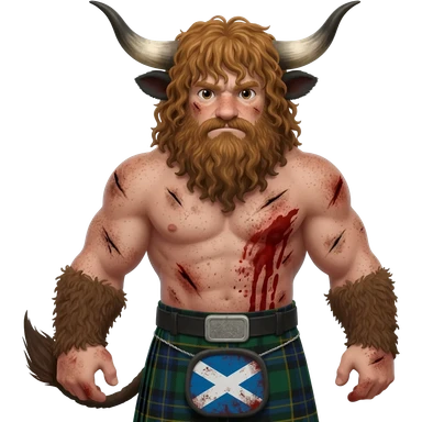 buff curly hairy man covered in dirt with freckles with messy light brown bangs that covers his face completely with bull horns and bull ears and bull tail dressed in kilt lifting large log with wind in his hair with belt around his chest emoji | AI Emoji Generator