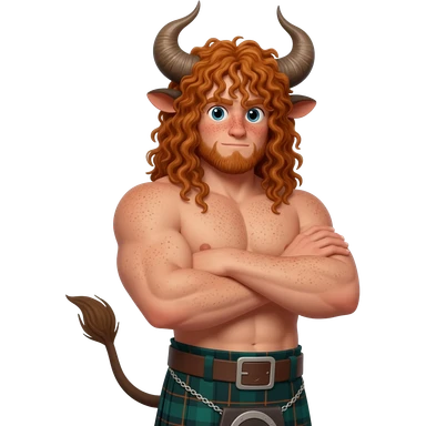 ginger curly buff hairy man with freckles with with messy extra long bangs covering the eyes like scottish bull with bull horns and bull ears and bull tail dressed in kilt posing with his arms crossed emoji