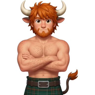 ginger buff hairy man with freckles with with messy bangs covering the eyes like scottish bull with bull horns and bull ears and bull tail dressed in kilt posing with his arms crossed emoji