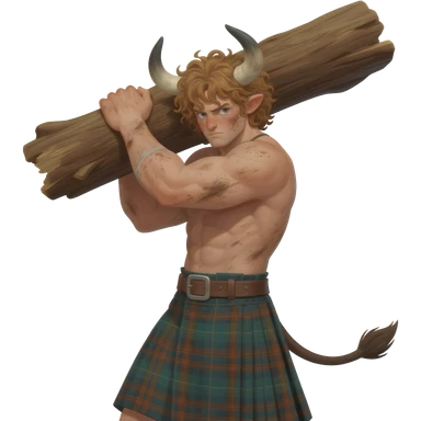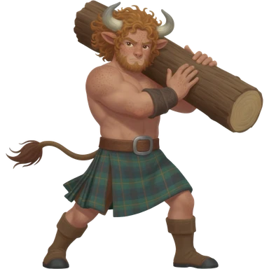 buff curly hairy man with freckles with messy light brown bangs that covers his face with bull horns and bull ears and bull tail dressed in kilt lifting large log with wind in his hair with belt around his chest emoji
