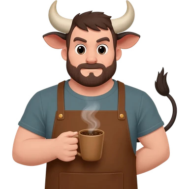 buff man with fat ass with bull ears and cow tail dressed like barista in brown apron with coffie in his hand emoji