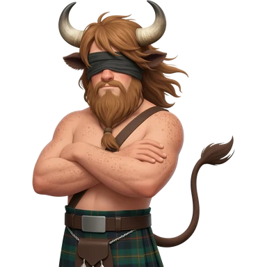 buff hairy man with freckles with messy light brown bangs that covers his face with bull horns and bull ears and bull tail dressed in kilt posing with his arms crossed with wind in his hair with belt around his chest emoji