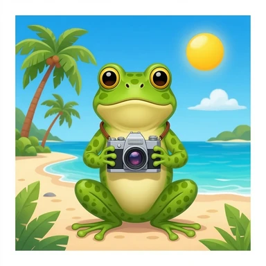 Place the bufo frog holding a camera on a sunny tropical beach, maintaining the green bufo frog emoji