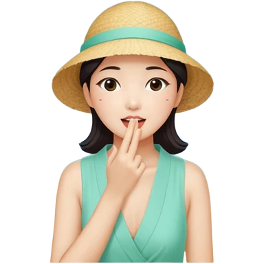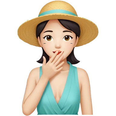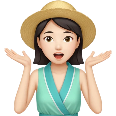 밝고 들뜬 표정의 20대 한국 여자, 여름 옷차림, 두 손을 입 근처에 두고 외치는 듯한 포즈. 민트색 배경, 유쾌한 광고 포스터 느낌, MZ 감성. 휴양용 옷차림 emoji