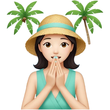 들뜬 표정의 20대 한국 여자, 여름 옷차림, 두 손으로 입을 감싸 “괌 가자~” 외치는 포즈. 민트색 배경, 밝고 유쾌한 광고 포스터 느낌, 옷이 더 하와이안 셔츠였음 좋겠어 멀리 있는 사람을 부르는 것처럼 배경이 바다였음 좋겠어 약간 야자수랑 돌핀도 있고 멀~리 있는 사람을 부르는 손! emoji