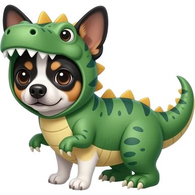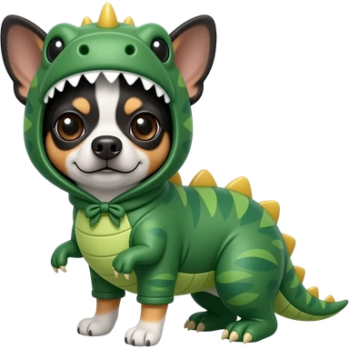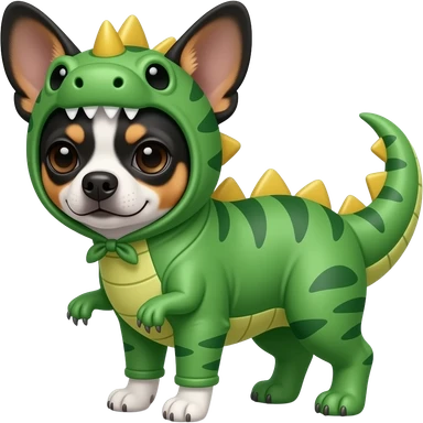 Un perro Chihuahua disfrazado de dinosaurio pero que el perro sea de color blanco y negro emoji