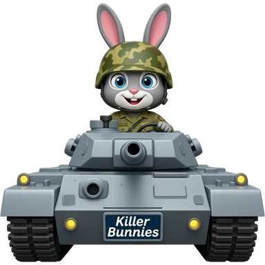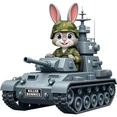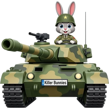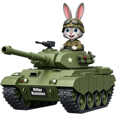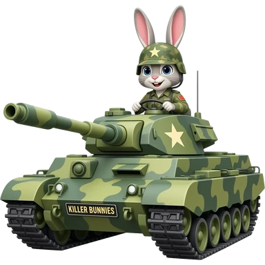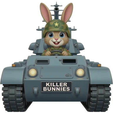 bunny in army fatigues driving a Tank text Killer Bunnies on bumper emoji