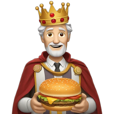 Older man wearing a Burger King crown with a burger in his hands emoji