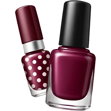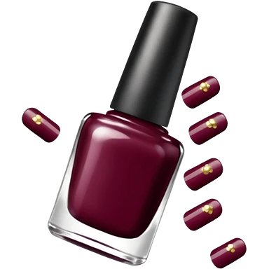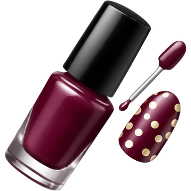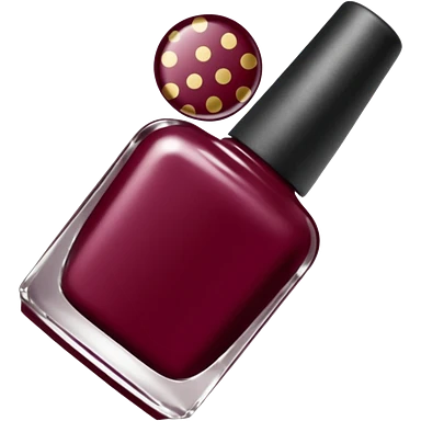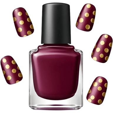 burgundy nail polish bottle, nail polish has light gold iridescence, cap is black with white polka dots, cinematic emoji emoji