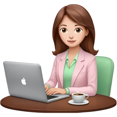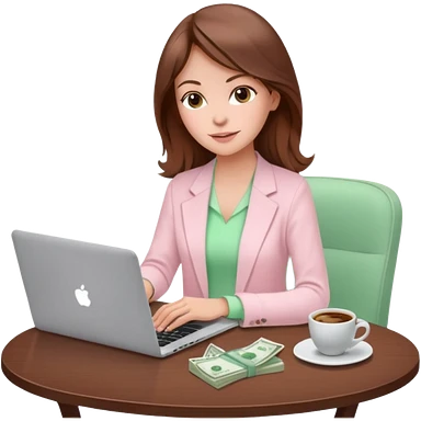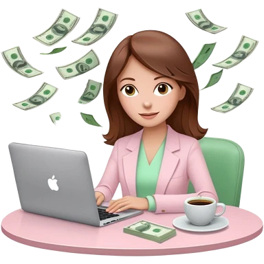 woman character dressed in pastel light pink with laptop and coffee relax table, dollars are floating, white laptop, brownn hair, fair skin, emoji