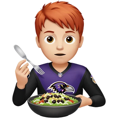a clean-shaven red haired young man in a ravens jersey eating a chipotle burrito bowl emoji