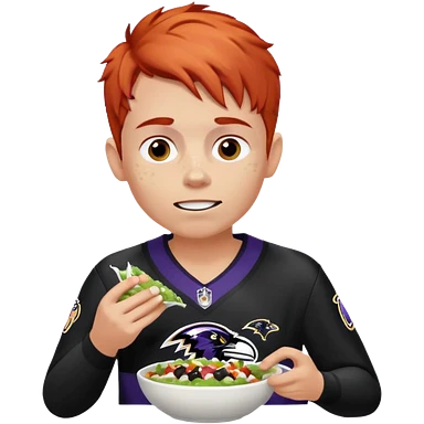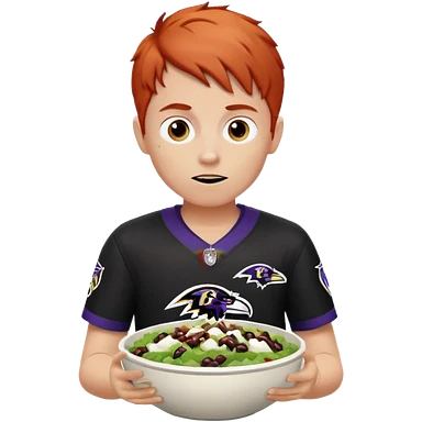 a red haired young man in a ravens jersey eating a chipotle burrito bowl emoji