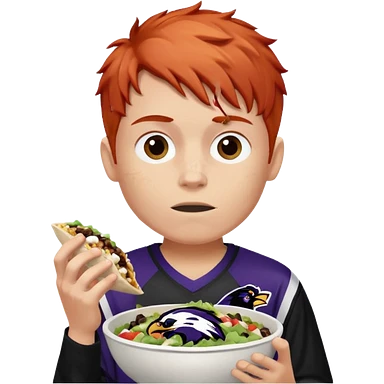 a red-haired boy wearing a ravens jersey and eating a chipotle burrito bowl emoji