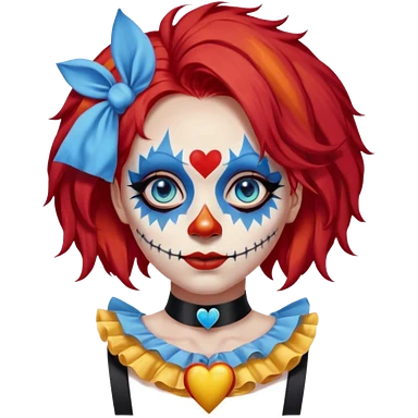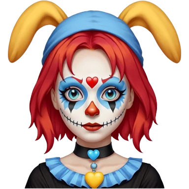 wendy thomas the clown from gta rp nopixel she has a blue sun covering right eye with three yellow lines below her right eye and above her left eye this is her clown makeup . she has long bright red hair and light blue eyes with ablack heart choker and black bunny ears. with a skeleton shirt emoji