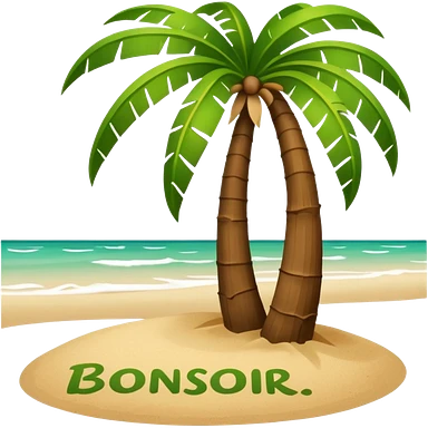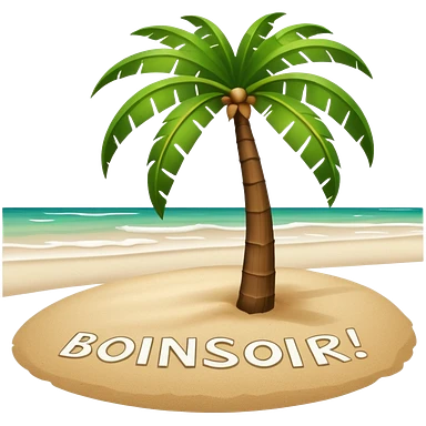 Un cocotier au bord d'une plage avec en arc de cercle écrit bonsoir emoji
