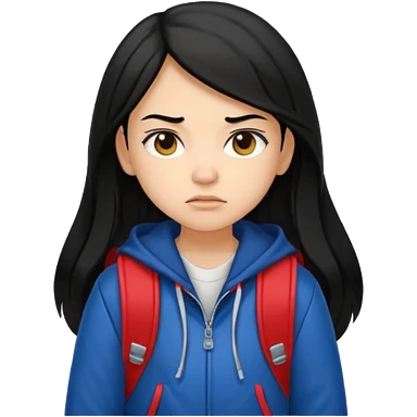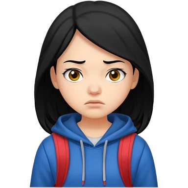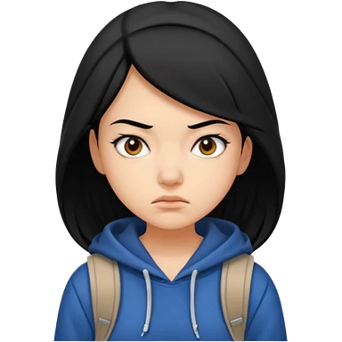 college student with annoyed face , black hair , with hoodie and backpack , girl emoji